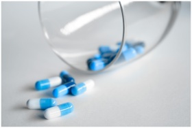 A close-up of blue and white capsules spilling fro