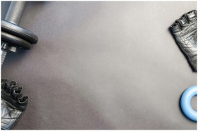 A flat lay of gym essentials including a dumbbell, gloves, and a fitness ring on a neutral background.