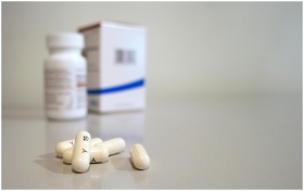 Close-up image of white capsules with medicine bot