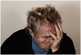 Portrait of an elderly man feeling stress and disappointment, holding his head in his hands.