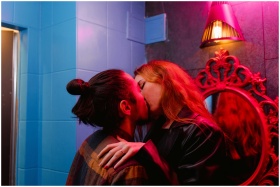 A couple shares a passionate kiss in a vibrant nig