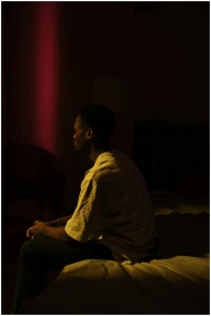 A contemplative man sits alone in a shadowy bedroo
