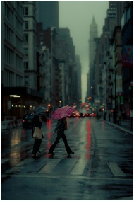 Two people crossing a rainy New York street with umbrellas and reflections.