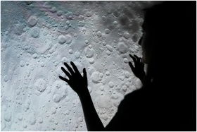 A mysterious silhouette of a woman interacting with a moon surface projection, evoking exploration and wonder.