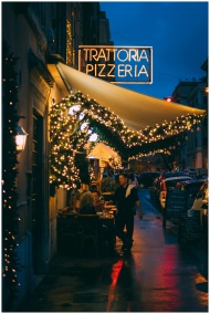 Inviting street view of a Trattoria Pizzeria with twinkling lights on a lively night.