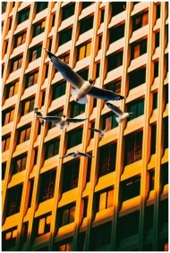 Seagulls soar against a sunlit Atlanta skyscraper,
