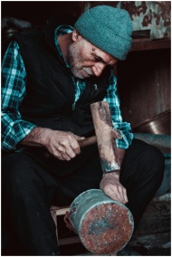 Elderly artisan meticulously hammering a metal obj