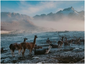 A serene view of llamas resting in a frosty highla