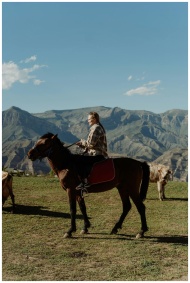 A woman rides a horse in a scenic mountainous countryside landscape under a clear blue sky.