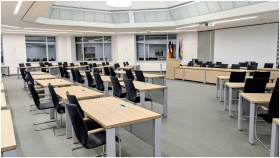 Spacious and modern meeting room in Niedersachsen, Germany, with desks and flags.