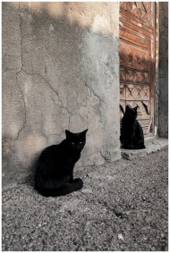 Two black cats sitting by an old wooden door in Yerevan, Armenia, conveying mystery and charm.