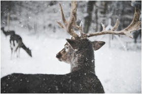Close-up of a deer with antlers in a snowy forest,