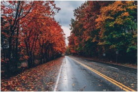 A serene road surrounded by bright autumn foliage in Long Pond, PA.