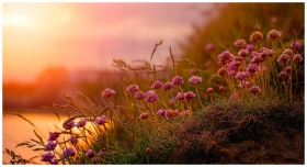 A beautiful scene of wildflowers blooming at sunset with a warm, golden glow.