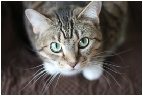 Close-up portrait of a tabby cat with striking green eyes and long whiskers.
