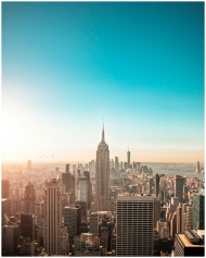 Breathtaking view of New York City's skyline featuring the iconic Empire State Building at sunrise.