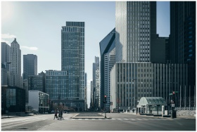 Urban cityscape of Chicago with towering skyscrapers and a calm street view.