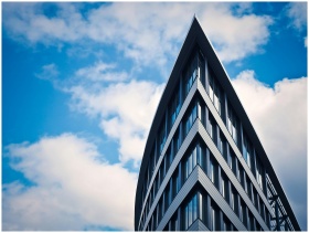 Futuristic skyscraper with glass facade set against a vibrant blue sky with clouds.