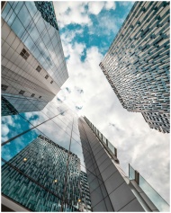 Low angle view of modern skyscrapers reflecting the cloudy sky in Brussels, Belgium.