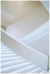 Vast stairway flight of white stone in spacious light mansion hallway in daylight