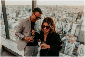 A joyful couple enjoying drinks on a rooftop with a stunning view of Buenos Aires at sunset.