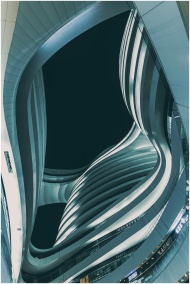 Low angle view of modern Milky Way Soho in Beijing at dusk. Futuristic curves and lines in dramatic urban setting.