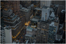 A dramatic aerial view of illuminated skyscrapers