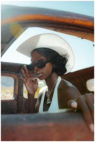 Stylish young woman with a hat and sunglasses posing in a vintage car outdoors.