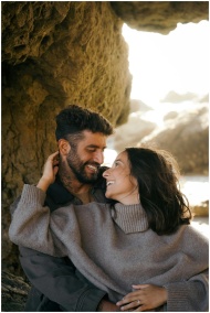 A loving couple embraces near rocky formations on a sunny Los Angeles beach.