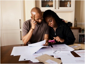 A couple sits at a table managing domestic finances, evaluating documents and using a smartphone.