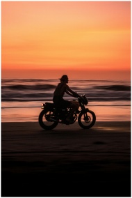 Silhouette of a motorcyclist riding on a beach in