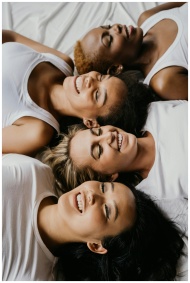 Four diverse women lying on a bed, smiling together, representing unity and friendship.