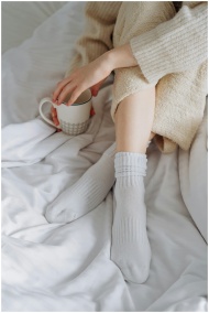 A woman relaxing in bed with white socks and a mug, creating a cozy atmosphere.