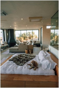 A contemporary Joshua Tree bedroom with plush bedding, stylish decor, and scenic views.