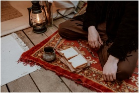 A cozy indoor setup with sandwich, lantern, and traditional rug, perfect for an intimate picnic.