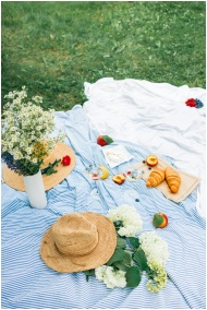 Elegant picnic scene with croissants, fruits, flowers, and wine glasses on a blanket outdoors.