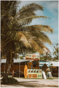 Street view of a vibrant food truck serving Korean BBQ in Honolulu under palm trees.
