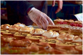 Delicious assorted pastries including custard slices and meringues at a London market stall.