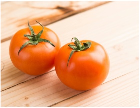 Close-up of two fresh tomatoes on a wooden table representing healthy eating.