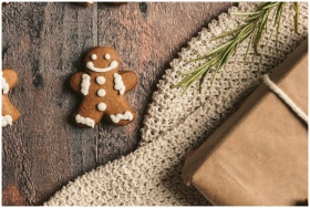Close-up of a gingerbread man cookie with gift and