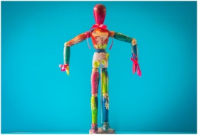 A vibrant wooden mannequin painted in various colo