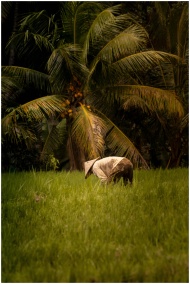A farmer wearing a conical hat works in a verdant