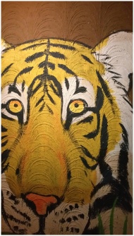 Close-up view of a vibrant tiger painting on a textured wall, showcasing artistic brush strokes.