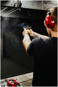 A man wearing ear protection shooting a handgun at