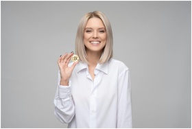 A cheerful woman displaying a bitcoin, embodying d