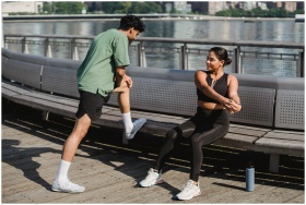 Two people stretching on benches by a riverside, engaging in outdoor exercise. Great for fitness and lifestyle themes.