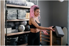 A fit yoga instructor with pink hair teaches in a studio with various yoga props.