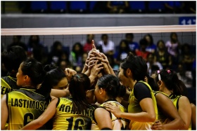 Female volleyball team huddles for a game in Quezon City, Philippines.