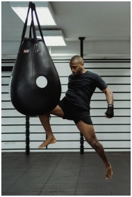 Athlete delivers a powerful kick to a punching bag in an intense training session.