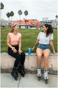 Two young women on rollerblades enjoying a casual day at the park, chatting and relaxing.